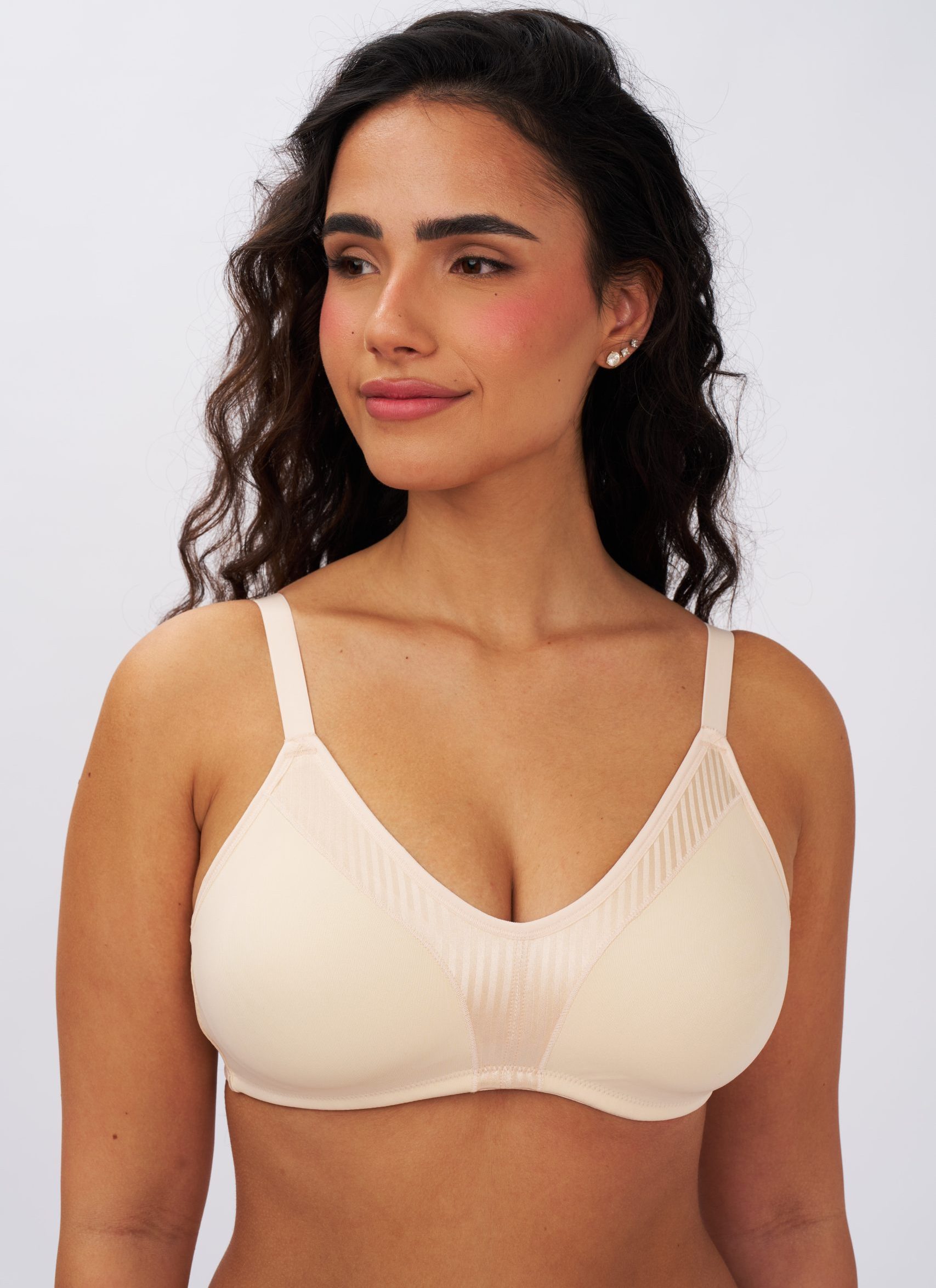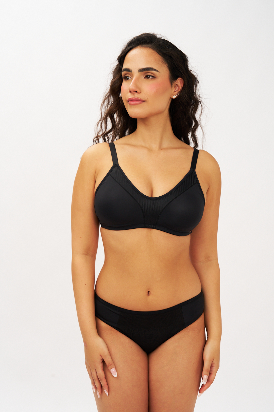 Jade is a wireless everyday bra designed to feel effortless while offering a naturally supported, flattering shape. Crafted from breathable, ultra-soft microfiber, it moves gently with you, creating a smooth, comfortable fit you barely feel. The flexible design adapts to your natural shape, while an inner side-support panel brings the bust inward for a refined, stable look. Double-lining technology adds uniformity, confidence, and extra support—without an underwire. Subtle glossy stripes elevate it from simple basics to a chic, stylish essential.