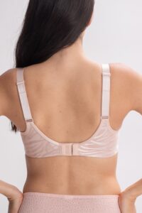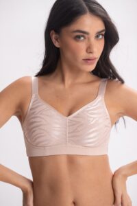 A non-wire minimizer bra with laminated fabric for firm support. Centers the bust and maintains a natural, slim look. Features leopard-patterned lace.